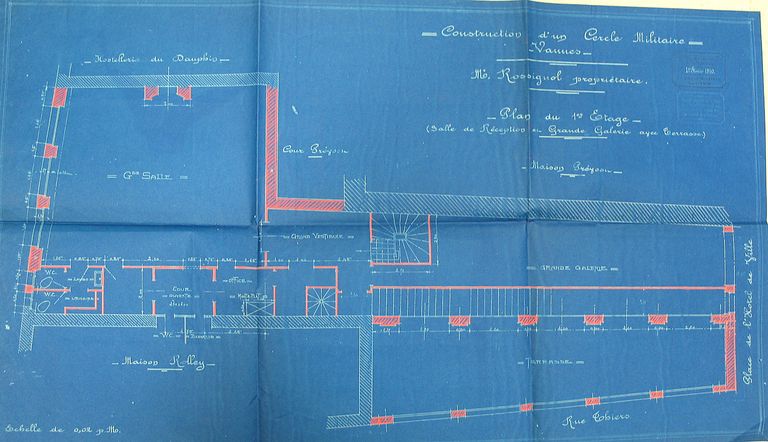 Construction d'un cercle militaire : plan du 1er étage par Lafont, 1910. AM Vannes 5I162.Immatriculation