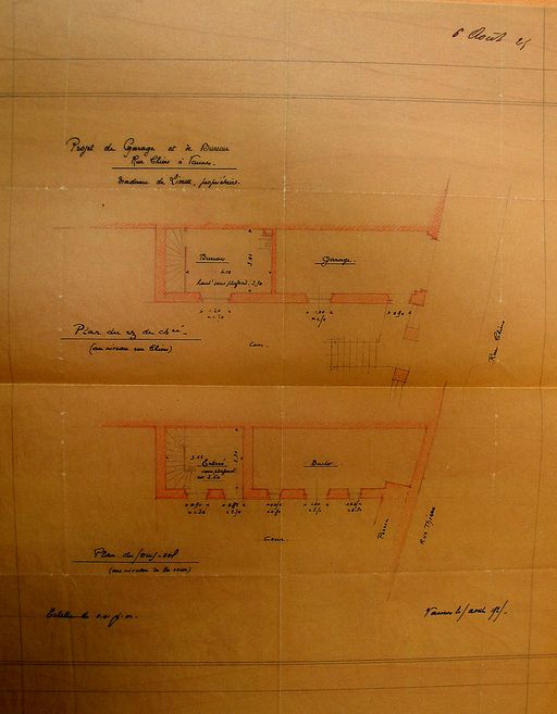 Projet de construction de garage et de bureau pour madame de Limur : plans au sol, août 1925. AM Vannes 5I162.Immatriculation