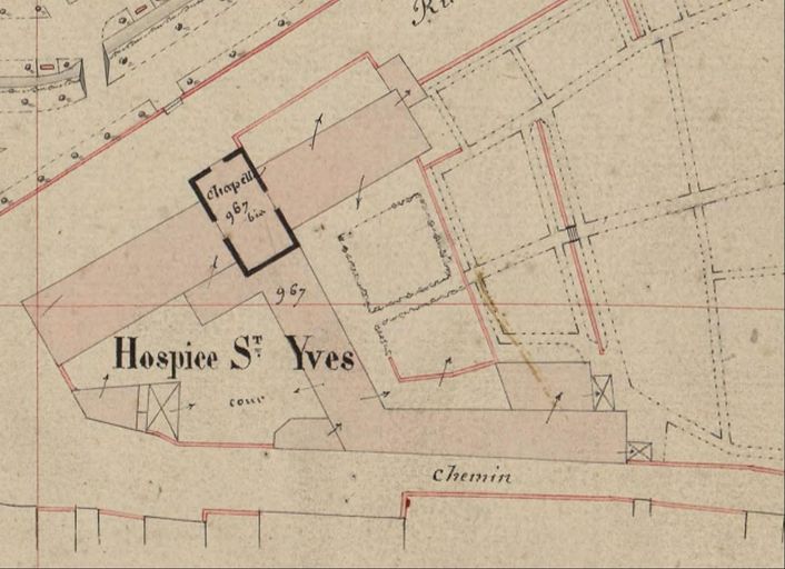 Plan cadastral de 1844 : section K4, détail hospice Saint-Yves. AD Morbihan 3P297/54.Immatriculation