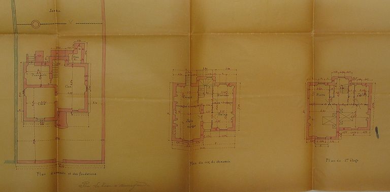 Plans des fondations, du rez-de-chaussée et du 1er étage de la maison Huchan, 1910. AM Vannes 5I162.Immatriculation