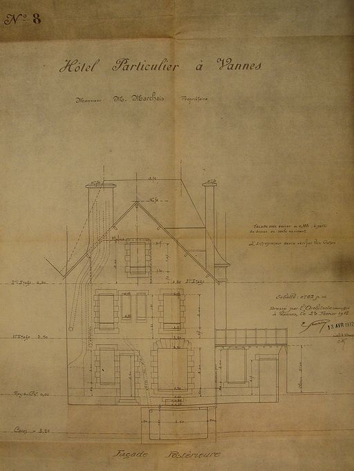 Elévation façade postérieure par E. Gemain, 1912. AM Vannes 5I162.Immatriculation