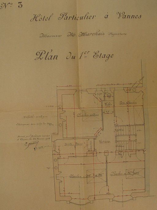 Plan du 1er étage par E. Gemain, 1912. AM Vannes 5I162.Immatriculation