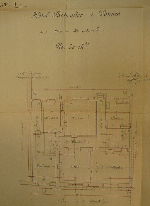 Plan du rez-de-chaussée par E. Gemain, 1912. AM Vannes 5I162.Immatriculation