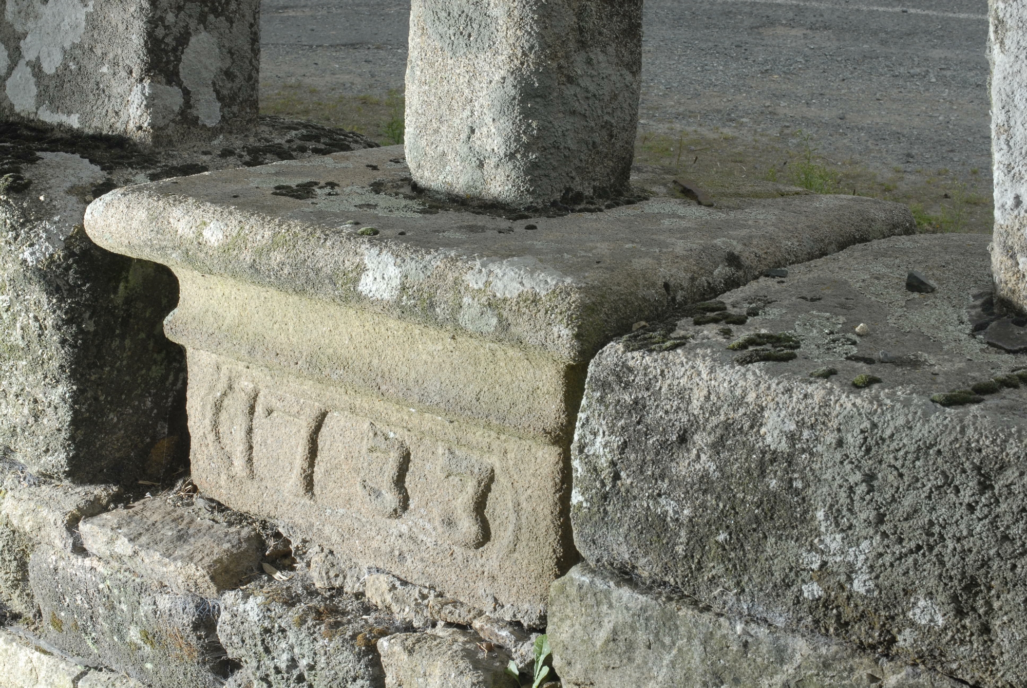 Ploubezre : l'ensemble des 5 croix, vue de détail de la croix centrale datée par millésime de 1733, revers du socleImmatriculation