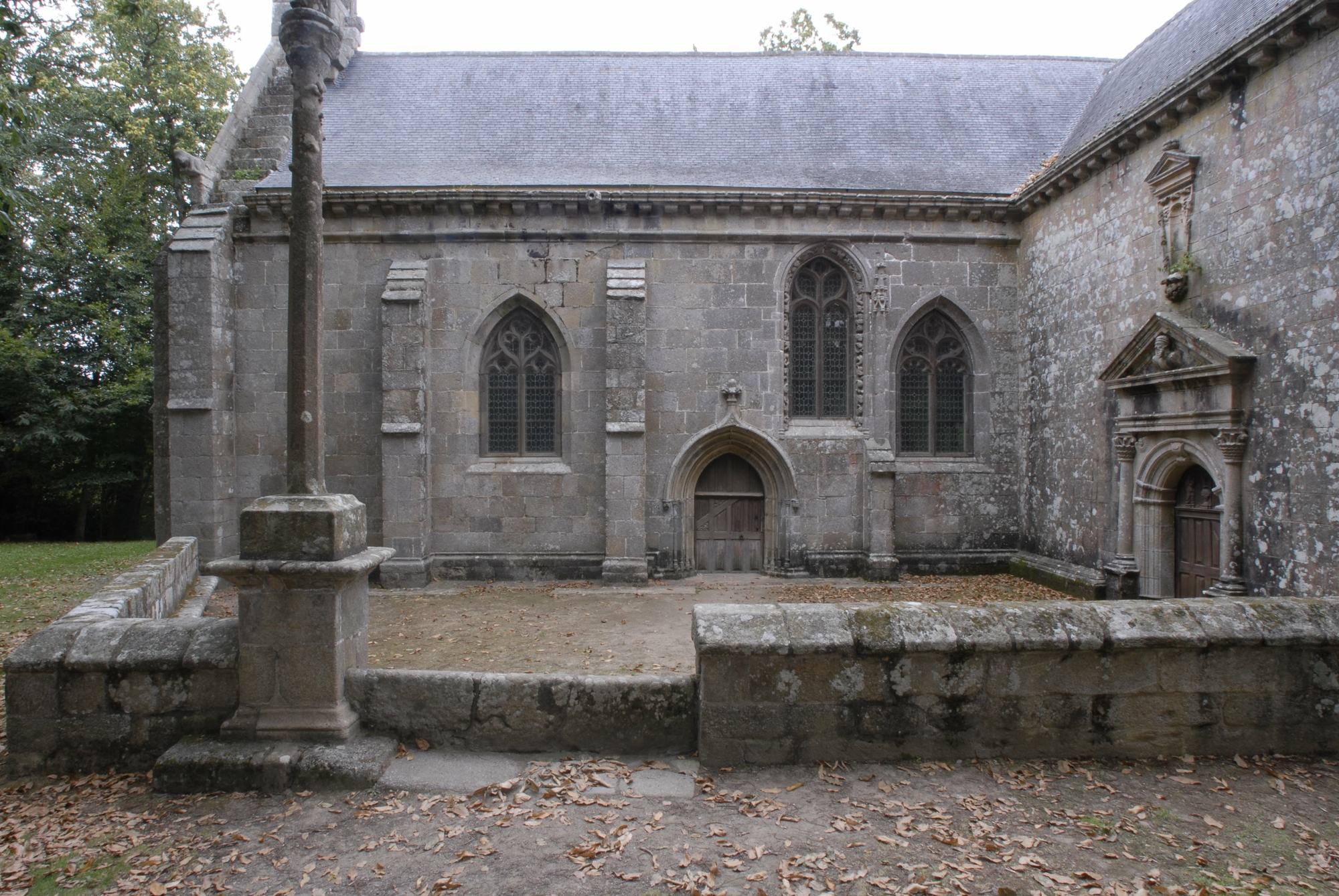 Ploubezre, chapelle de Kerfons : élévations sud. Le contraste est saisissant entre le Gothique flamboyant de la nef, vraisemblablement datable de la fin du 14e siècle ou du début du 15e siècle et la première Renaissance bretonne visible dans le bras sud (chapelle dédiée à Saint-Yves) datée des années 1553-1559. Au premier plan, le calvaire est datable du 15e siècleImmatriculation