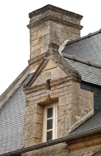 Détail du décor sculpté : lucarne à fronton triangulaire , datée 1732 et souche de cheminéeImmatriculation