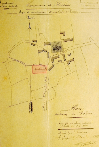 Plan de situation de l'emplacement de l'école dressé le 20 décembre 1883 par l'agent-voyer principal Kerbrat (AD 22)Immatriculation