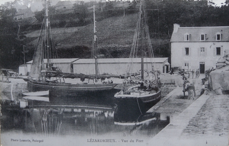 Le trafic des pommes de terre de primeur et des pommes à cidre au port de Lézardrieux, fin 19ème siècle : remarquer le parement en moellons des quais et le couronnement en pierres de taille de la jetée (collection particulière, carte postale)Immatriculation