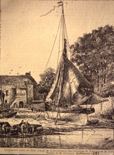 Extrait de la revue 'Le Yacht', 1887 : gravure de Faudacq représentant le cotre de surveillance des huîtrière 'Le Canard' au port de Lézardrieux, fin 19ème siècle (collection particulière)Immatriculation