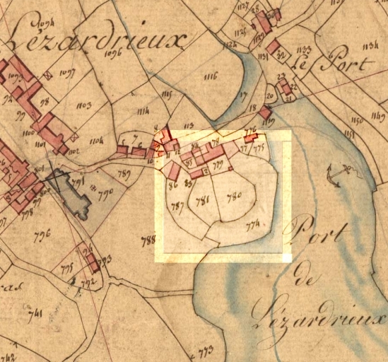 Lézardrieux, le bourg. Le site fortifié d'origine médiévale d'après un extrait du plan cadastral parcellaire de 1827 (AD 22) : on distingue au nord-est de l'église, jouxtant le port, l'emprise de l'ancienne motte castrale (parcelles 774, 780-781, 787)Immatriculation