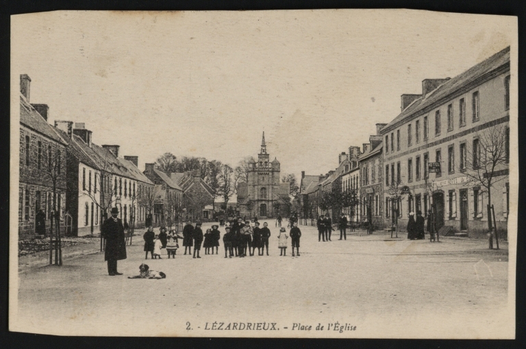 Vue générale du bourg : la place de l'église depuis l'ouest, 1er quart du 20ème siècle (AD 22)Immatriculation