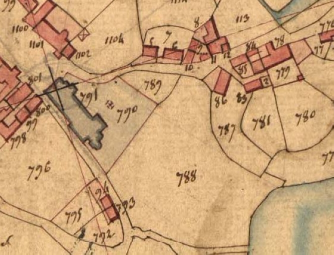 Extrait du cadastre de 1827 : les maisons de la partie Nord du bourg, dont la maison de la Pitance C 801 (AD 22)Immatriculation