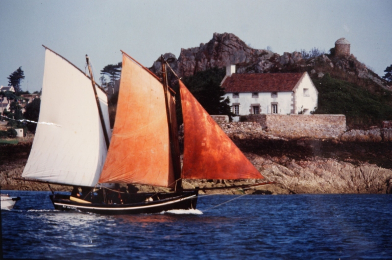 Vue du corps de garde au passage d'un voilier traditionnel, vers 1990Immatriculation