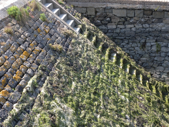 Vue du mur de quai Sud, équipé d'un escalier, avec une forme déclivité, formant le 'nez' du bassinImmatriculation