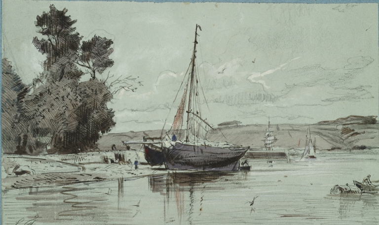 Dessin aquarellé de Faudacq : échouage d'un caboteur au niveau des anciens quais, fin 19ème siècle (collection particulière)Immatriculation