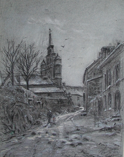 Dessin de Faudacq : la côte qui mène depuis le port au bourg de Lézardrieux, 3ème quart 19ème siècle, avec l'ancien mur, portant la croix (collection particulière)Immatriculation