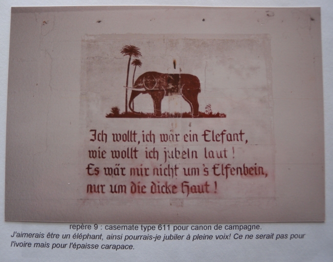 Photographie d'un dessin représentant un éléphant au mur Est de la pièce réservée au cantonnement dans la casemate H 611 : repère 9 sur la carte (Bohée, Alain, collection particulière)Immatriculation