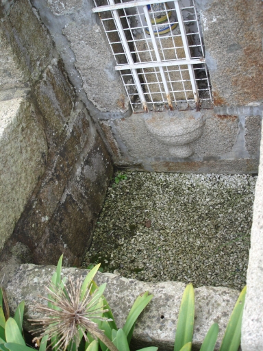 Vue du bassin carré et de la niche ouvragée, fermée par une grille, abritant une statuette de la ViergeImmatriculation