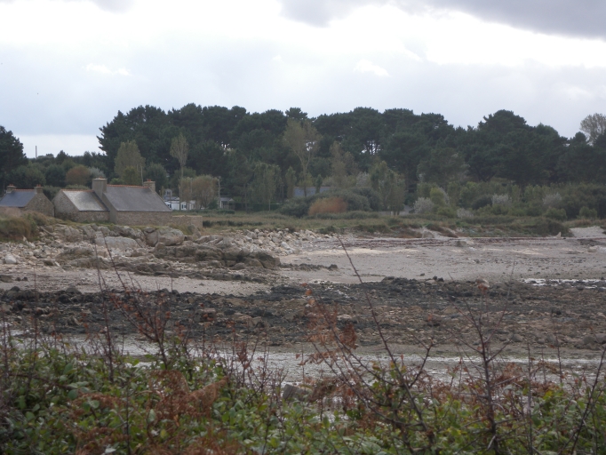 Vue générale du site depuis la grève : entre les flancs Ouest du promontoire du phare et Poull DerrienImmatriculation