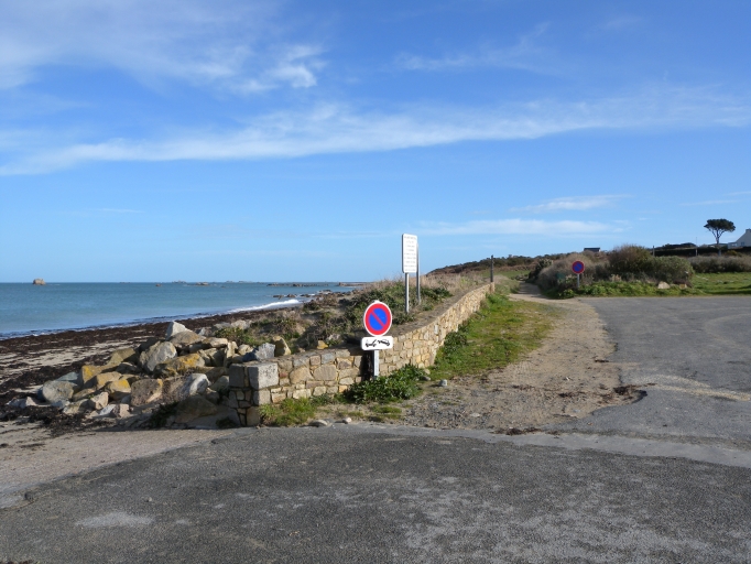 Vue du muret de protection au Nord-Est et du sentier littoral au Nord-Est du parking et de l'aire de jeu de Pors RandImmatriculation