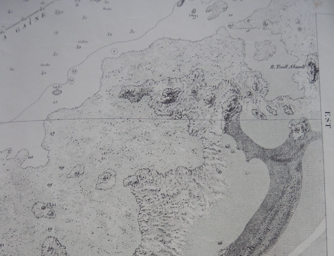 Extrait de la carte marine du SHOM levée en 1837 : la pointe du Sillon de Talbert et une partie de l'archipel d'Ollone (EPSHOM, collection particulière)Immatriculation