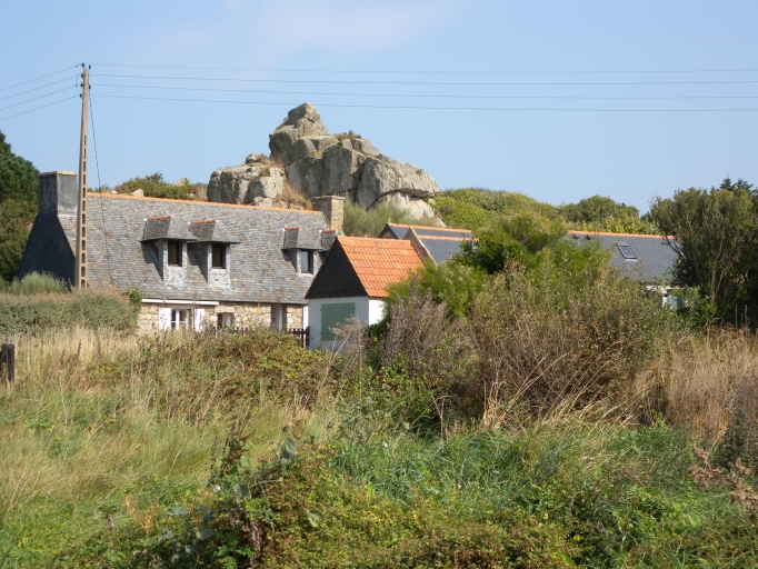 Vue d'un ancien bâti rénové et remanié en place de la chaumière dit du 'Chabous' de Yves Lamandé, au pied du rocher de KervagenImmatriculation