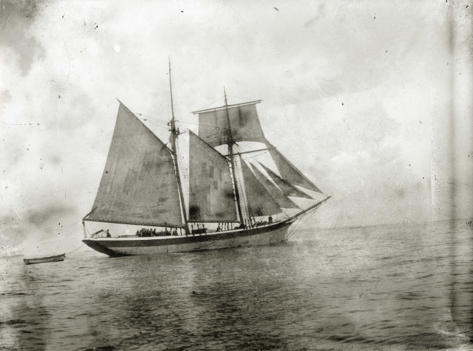 Vue de la goélette 'La Bretonne', quittant Roscoff avec un équipage de 'Johnnies', 2ème quart 20ème siècle (collection particulière)Immatriculation