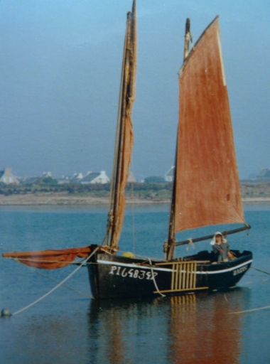 Bateau goémonier ('An Durzhunel') avec sa civière amarrée sur un bord, au Sillon de Talbert, 1990Immatriculation
