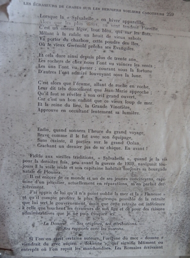 Extrait de l'ouvrage 'Les écraseurs de crabes' de Louis Lacroix, 1949, annotée par Joseph L'Hégarrat : la chanson sur le capitaine Jean-Marie Meudal de Pleubian (collection particulière)Immatriculation