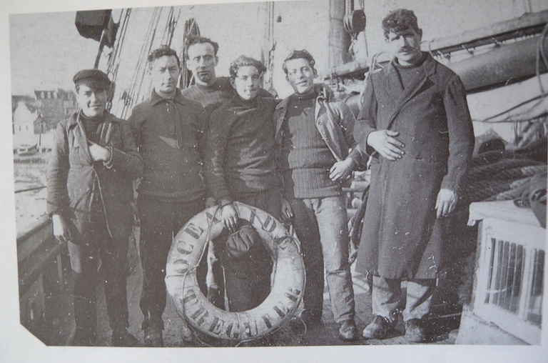 L'équipage de la goélette 'Océanide' en 1928, à quai à Roscoff : François Paranthoën de L'Armor, Roger Le Floch et Robert Le Pivaing de Lanmodez, Lamandé de Pleubian (collection particulière)Immatriculation