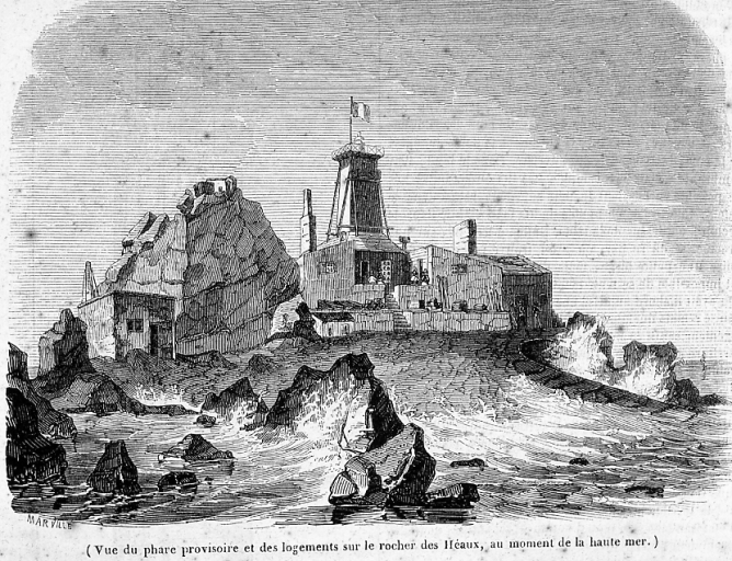 Dessin : vue du phare provisoire sur le plateau des Héaux de Bréhat septembre 1845 (collection particulière, le 'Magasin Pittoresque')Immatriculation