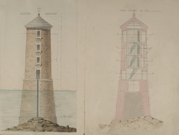 Détail : élévation principale et coupe du phare de la Corne, 1869 (AD 22)Immatriculation