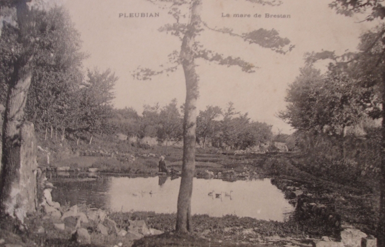 Vue de la mare de Brestan , faisant fonction de lavoir, à proximité de la chapelle, 1er quart 20ème siècle (carte postale, collection particulière)Immatriculation