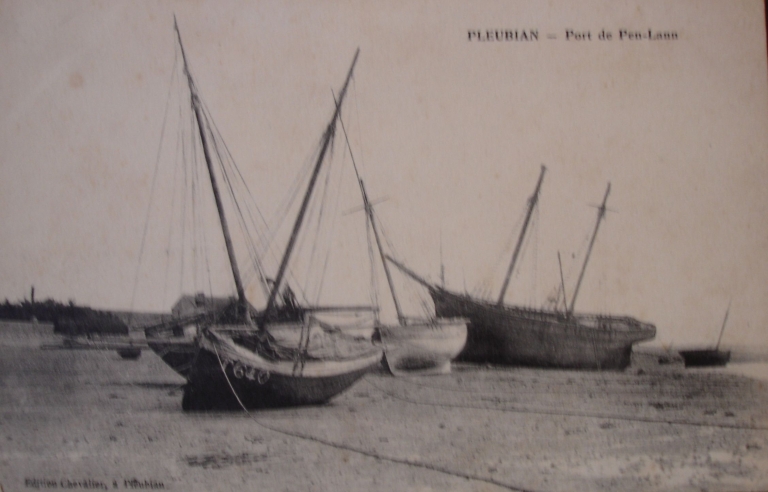 Vue des sloops de pêche et gabarres échoués dans la grève de Pen Lan, 1er quart 20ème siècle (carte postale, collection particulière)Immatriculation