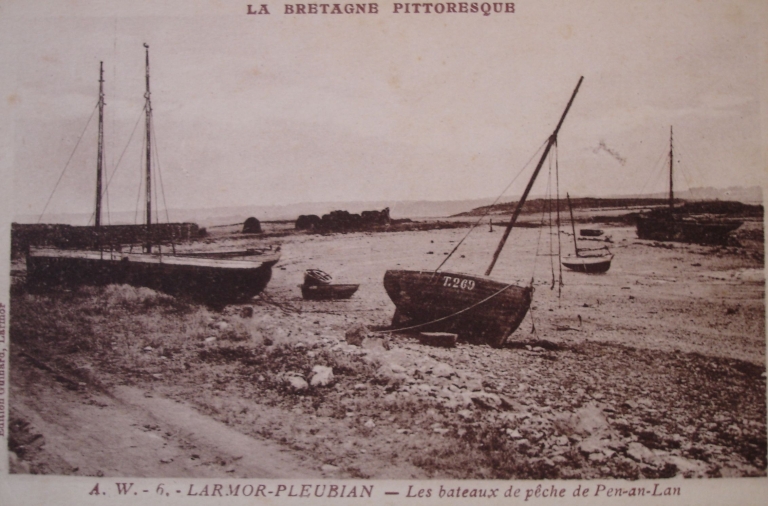 Gabarres et bateaux goémoniers échoués en aval dans la petite grève de Penn Lann : remarquer les meules de goémon, 1er quart 20ème siècle (carte postale, collection particulière)Immatriculation