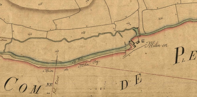 Extrait du cadastre de 1829 : le moulin à eau de Milin Koz Izellan : B1ère feuille 167 (AD 22)Immatriculation