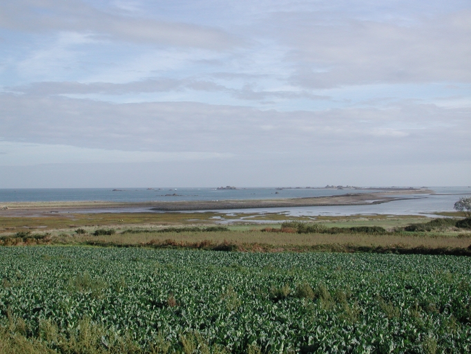 Vue des composantes paysagères de la 'Petite Grève' à marée basse : les champs cultivés, la roselière, l'ancienne dune de Rhun Traou, le marais littoral à spartines et zoostères, protégé par le Sillon de TalbertImmatriculation