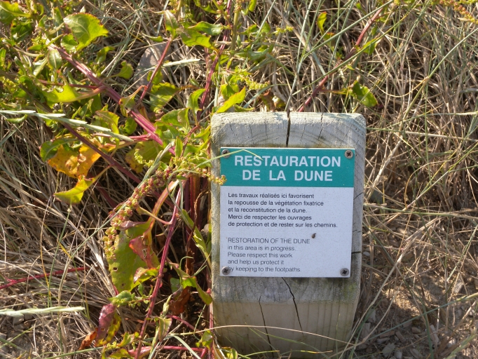 Vue des aménagements réalisés sur le Sillon de Talbert pour protéger la dune et informer le public (Conservatoire du Littoral)Immatriculation