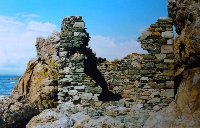 Vue des ruines d'une plateforme et d'un bâtiment situé au Nord-Ouest du plateau rocheux, au-dessus des plus hautes mers : abri pour les ouvriers du chantier du 19ème siècle et site de la tourelle provisoireImmatriculation