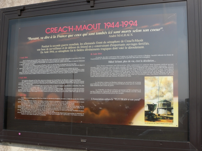 Vue du panneau d'interprétation sur l'histoire tragique du site entre le 3 et le 16 août 1944 (Association 'Pleubian et son passé)Immatriculation