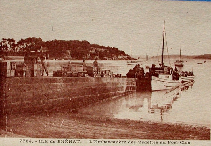 Débarquement des marchandises à la 1ère cale : la 'Vieille', surnom de la 1ère vedette de transport motorisée ''Île de Bréhat', et derrière la 'petite Bréhatine', en fer, 1er quart 20ème siècle (carte postale, collection particulière)Immatriculation