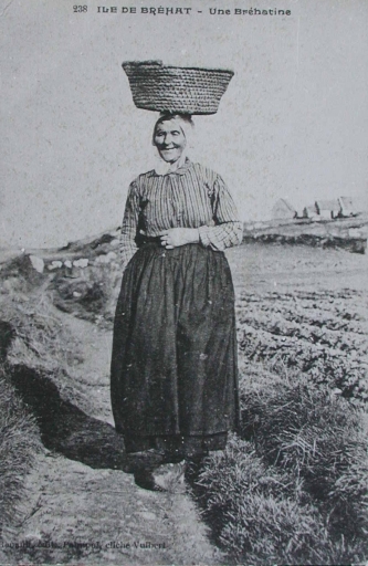 Bréhatine avec son panier sur la tête, à la manière des sennantes : 'tante Rose' Le Dougre, épouse Raoul, 1er quart 20ème siècle (carte postale, collection particulière)Immatriculation