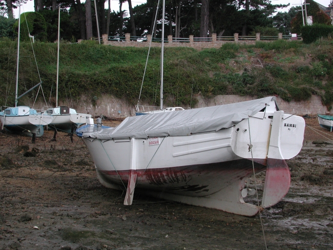 Vue d'un ancien bateau de pêche échoué dans une grève de la 'Chambre' : remarquer la large tableau et la forme tulipée de l'étrave, le vaigrage extérieur des bordés (pour prévenir du ragage des engins de pêche), la rablure rondeImmatriculation