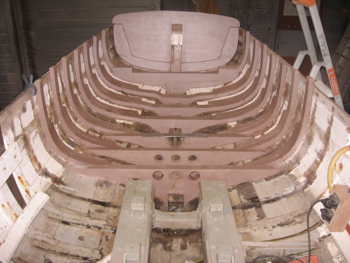 Vue des travaux de réfection intérieure avant le changement des bordés (collection particulière, Benoit Le Bideau)Immatriculation
