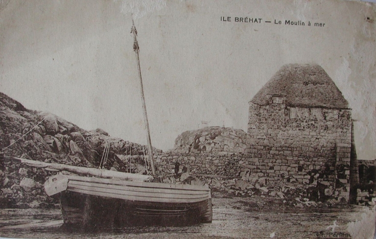 Vue du site du moulin du Birlot, avec un bateau échoué devant l'anse qui borde le Kerpont, 1er quart 20ème siècle (carte postale, collection particulière)Immatriculation