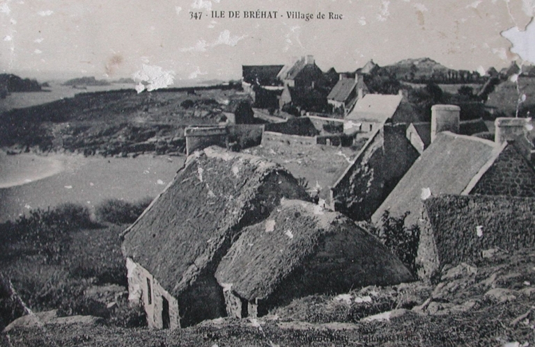Vue du front de mer du Birlot avec ses maisons traditionnelles au toit en chaume, 1er quart 20ème siècle (carte postale, collection particulière)Immatriculation