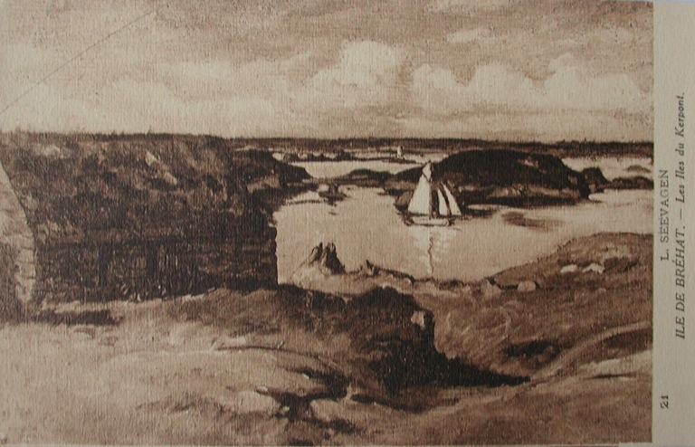 Vue des îles du Kerpont, dont l'île Grouézen, depuis l'ancienne bergerie du Birlot, peint par Seevagen, 1920 (collection particulière)Immatriculation