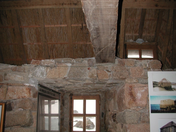 Vue de la maçonnerie intérieure et de la charpente : reconstitution des arasements en partie haute par les services techniques de la commune, en 1990Immatriculation
