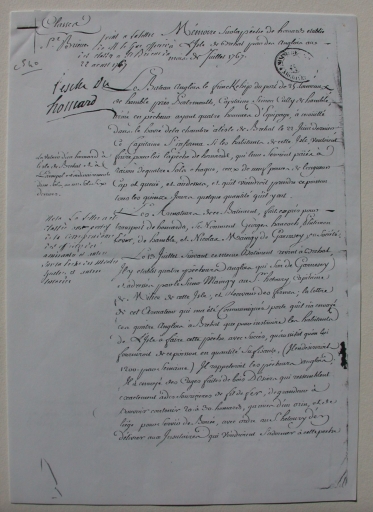 Manuscrit (1ère page) daté du 22 août 1767 sur la pêche aux homards à Bréhat (collection particulière)Immatriculation