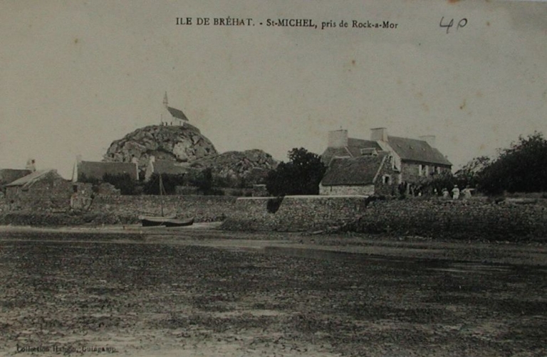 Vue de la grève du Birlot, devant le moulin à marée, avec les murs de grève, 1er quart 20ème siècle (carte postale, collection particulière)Immatriculation